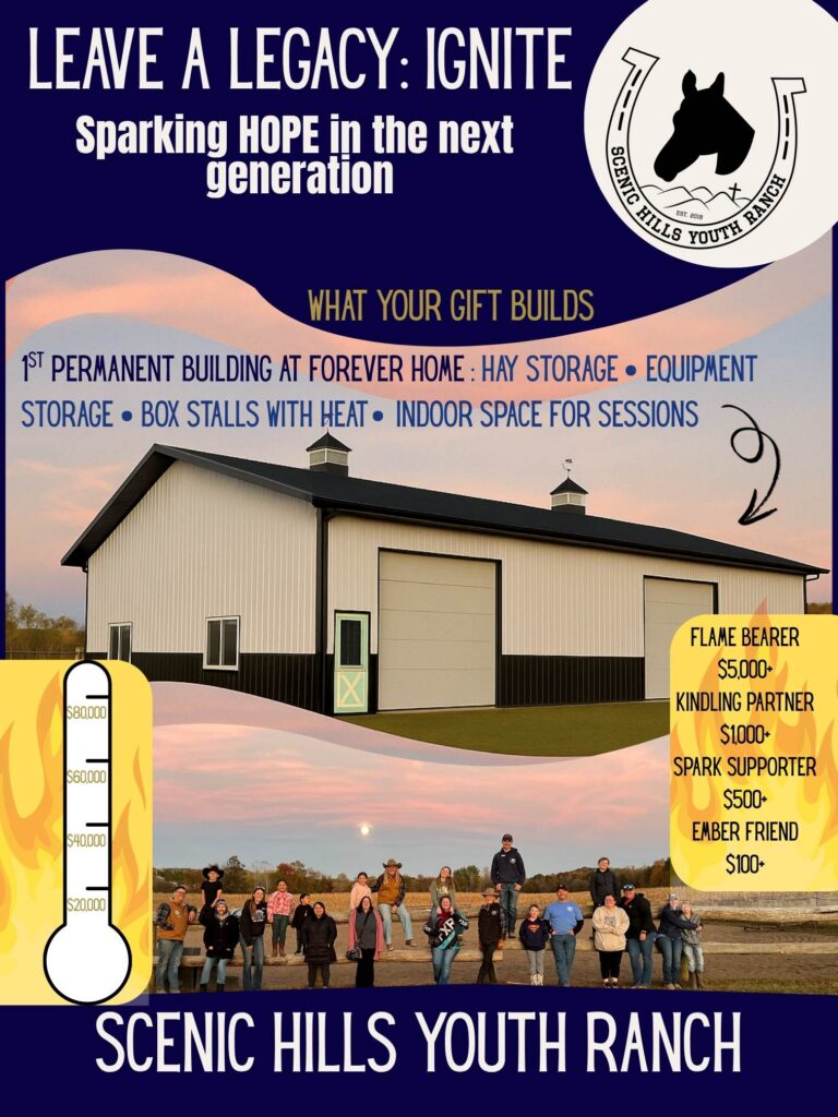 Join us in lighting the fire of HOPE in the next generation. Phase one includes a basic building which will allow for indoor space for sessions in case of rain, basic needs for our horses and hay/equipment storage. We are working to raise $80,000 for Phase One. Donate online or send a check. Click on the ‘Donate’ tab above to see how you can give.
